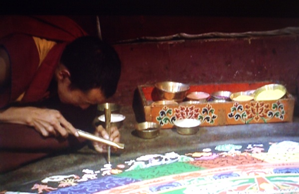 Los monjes nos muestran la forma de diseñar mandalas con arena de colores. Un mandala es un dibujo que se emplea para ayudar en la meditación. La palabra significa palacio y representa el universo, y también el arquetipo del laberinto que es necesario recorrer y llegar a su centro para alcanzar la iluminación. Se tarda unos siete años en aprender la técnica para dibujar mandalas. Según enseñó Buda, «nada existe, ni siquiera los dioses», por eso los mandalas una vez acabados se destruyen, para significar lo efímero de todas las cosas.