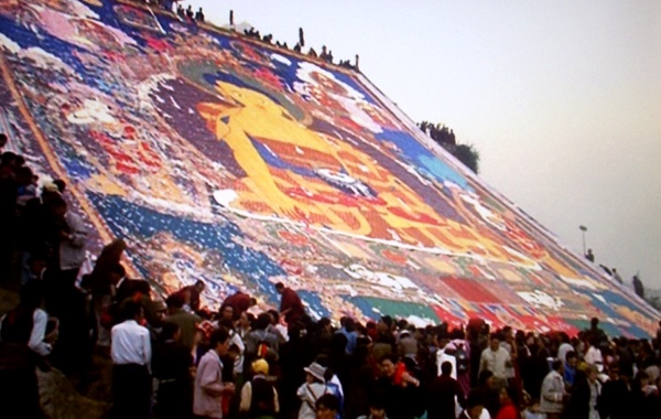 Asistimos a la fiesta anual del monasterio de Drepung y al despliegue del ‘gran tangka’, una gigantesca imagen de Buda, hecha de lana, seda y oro, que los monjes desenrollan en la ladera de un monte.