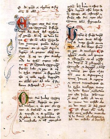 Y cuando los dichos Embajadores llegaron a esta ciudad, hallaron en ella un Embajador que el Sultán de Babilonia enviaba al Tamurbec. El cual llevaba consigo hasta veinte de caballo y hasta quince camellos cargados de presente, que el Sultán enviaba al Tamurbec, y otrosí llevaba seis avestruces y una alimaña que es llamada jirafa, la cual alimaña era hecha de esta guisa: había el cuerpo tan grande como un caballo, y el pescuezo muy luengo, y los brazos mucho más altos de las piernas, y el pie había así como el buey hendido, y desde la uña del brazo hasta encima del espalda había diez y seis palmos: y desde las agujas hasta la cabeza había otros diez y seis palmos, y cuando quería enhestar el pescuezo, alzábalo tan alto que era maravilla, y el pescuezo había delgado como de ciervo, y las piernas había muy cortas según la longura de los brazos, que hombre que no la hubiese visto bien pensaría que estaba sentada aunque estuviese levantada, y las ancas había derrocadas a yuso como búfalo: y la barriga blanca, y el cuerpo había de color dorado y rodado de unas ruedas blancas grandes: y el rostro había como de ciervo, en lo bajo de hacia las narices: y en la frente había un cerro alto agudo, y los ojos muy grandes y redondos y las orejas como de caballo, y cerca de las orejas tenía dos cornezuelos pequeños redondos, y lo más de ellos cubiertos de pelo, que parecían a los del ciervo cuando le nacen, y tan alto había el pescuezo y tanto lo extendía cuanto quería, que encima de una pared que tuviese cinco o seis tapias en alto podría bien alcanzar a comer: otrosí encima de un alto árbol alcanzaba a comer las hojas, que las comía mucho.
