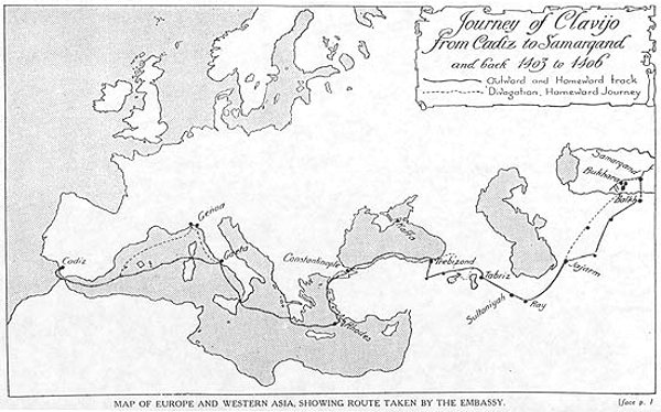 Clavijo partió al frente de su expedición del Puerto de Santa María, visitó la isla de Rodas y Constantinopla y desembarcó en Trebisonda, en los confines del mar Negro. Desde allí prosiguió el difícil viaje por tierra, atravesando regiones que hoy pertenecen a los estados de Turquía, Irak e Irán y llegando a Samarkanda (en el actual Uzbekistán) en septiembre de 1404. Por desgracia, Tamerlán se encontraba enfermo y moriría poco después, por lo que la misión de los castellanos, desde el punto de vista diplomático, fue un fracaso. Clavijo emprendió el viaje de regreso, llegando a España en marzo de 1406.