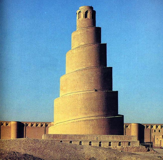 El minarete helicoidal Al Malwiya (la espiral) de la gran mezquita de Samarra data del siglo IX y fue mandado erigir por el califa abasí Al Mutawakil. Su construcción se supone inspirada en el zigurat de la antigua Babilonia, que a su vez suele identificarse con la bíblica torre de Babel.