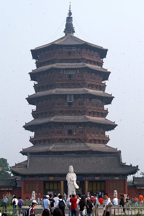 Lo más peculiar es que la pagoda está enteramente construida por piezas de madera, ensambladas con espigas, sin utilizar un solo clavo. Tiene una altura de 67,31 m (equivalente a un moderno edificio de 20 plantas) y el diámetro en su base es de 30,27 m. Comparada con la torre de Pisa, es 115 años más antigua y unos 11 metros más alta.