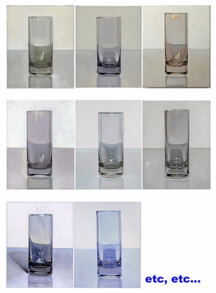 Desde hace años, el artista alemán Peter Dreher ha pintado cada día un vaso vacío, con diferentes tipos de luz, unas veces de día y otras de noche. Lleva pintados unos 3.500 vasos iguales.