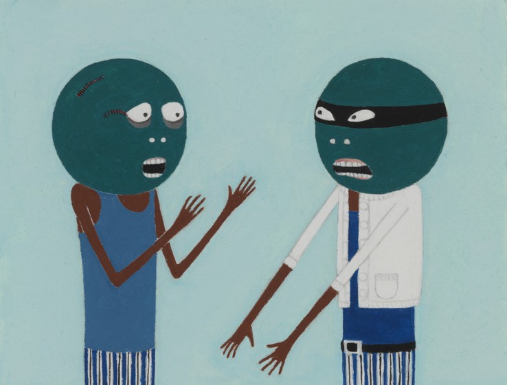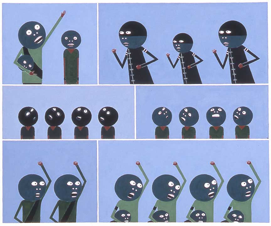 Las pinturas de Laylah Ali (Buffalo, Nueva York, 1968) recuerdan a viñetas de cómic, pero también contienen referencias estilísticas a los jeroglíficos egipcios y a las tradiciones folklóricas americanas.