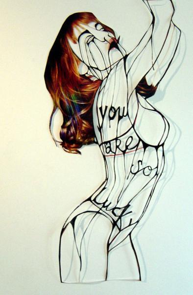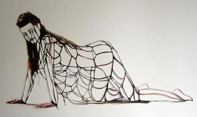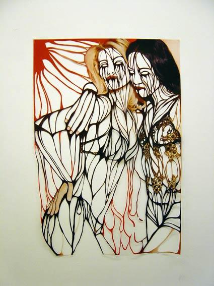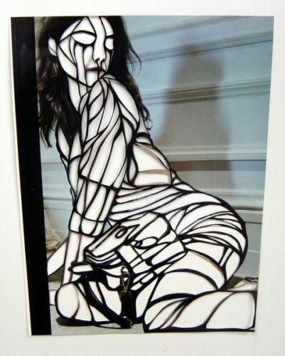 Amie Dicke (1978, Rotterdam, Holanda) compone sus obras a base de recortar imágenes. Dicke utiliza fotos de modelos y estrellas de cine, tal como aparecen en carteles y revistas de moda, como su material de partida. En un proceso lento y laborioso, recorta con tijeras el interior de cuerpos y caras, hasta dejar solamente unas finísimas líneas de contorno.