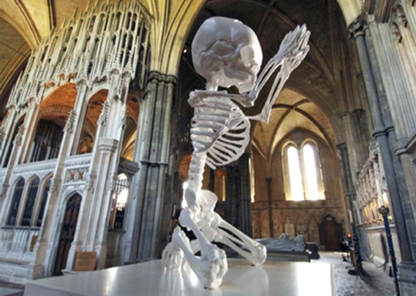 Pero hay excepciones. Su última ocurrencia me parece cuanto menos curiosa. Es ese esqueleto de la foto, instalado en la catedral de Winchester. Es de bronce pintado de blanco y mide 30 cm. Como modelo ha usado un feto de 22 semanas. Se llama Angel.