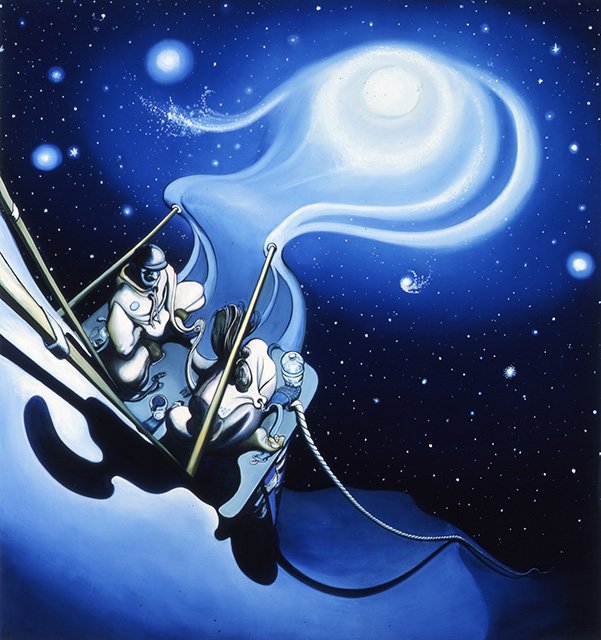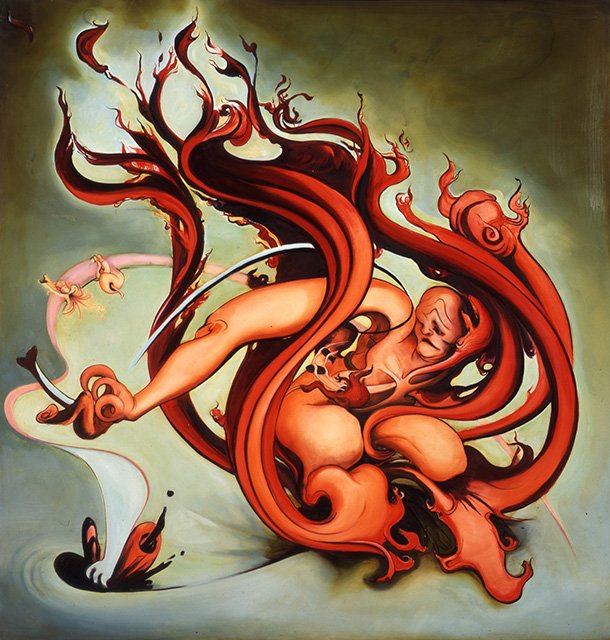 La obra de Inka Essenhigh (1969, Belfonte, Pennsylvania) puede calificarse de intrigante, inquietante y hasta ondulante si quieren. Entre lo surrealista y lo abstracto, a mí me ha recordado al dibujante de cómic Moebius.