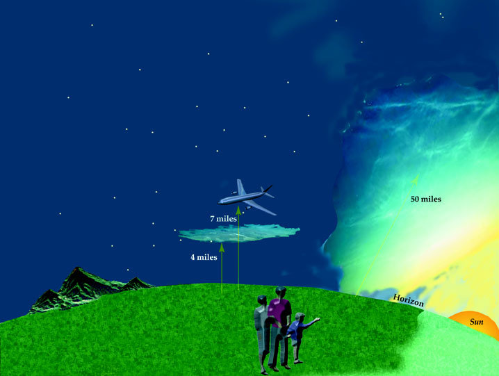 Desde la superficie de la Tierra, las nubes noctilucentes sólo son visibles cuando son iluminadas por la luz del sol desde abajo, lo que implica que la luz solar no ilumina el suelo ni las capas inferiores de la atmósfera, que ya están en sombra en la Tierra.