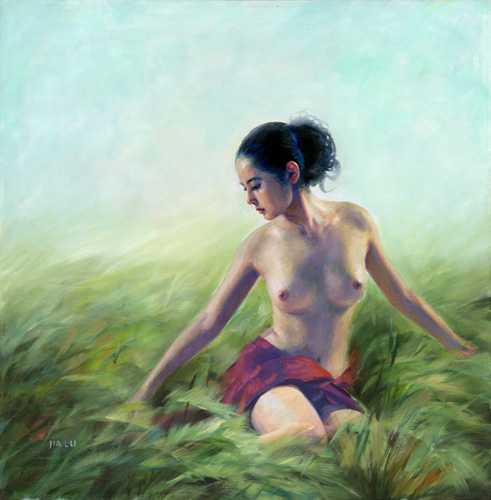 Jia Lu: “Las ideas para mis pinturas vienen de mis lecturas poéticas y filosóficas, y de las artes visuales, como el cine y el teatro. Me encanta la ópera y la danza, porque adoro la luminación dramática y los escenarios elaborados.”