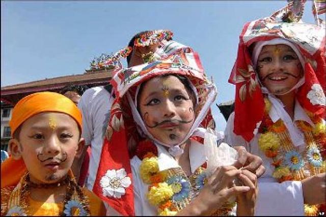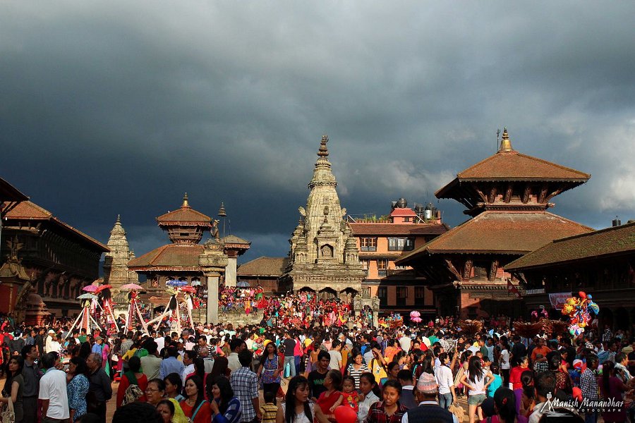 En la ciudad de Bhaktapur (su nombre significa «ciudad de devoción»), la fiesta se prolonga durante una semana y termina con la celebración del nacimiento de Krishna.
