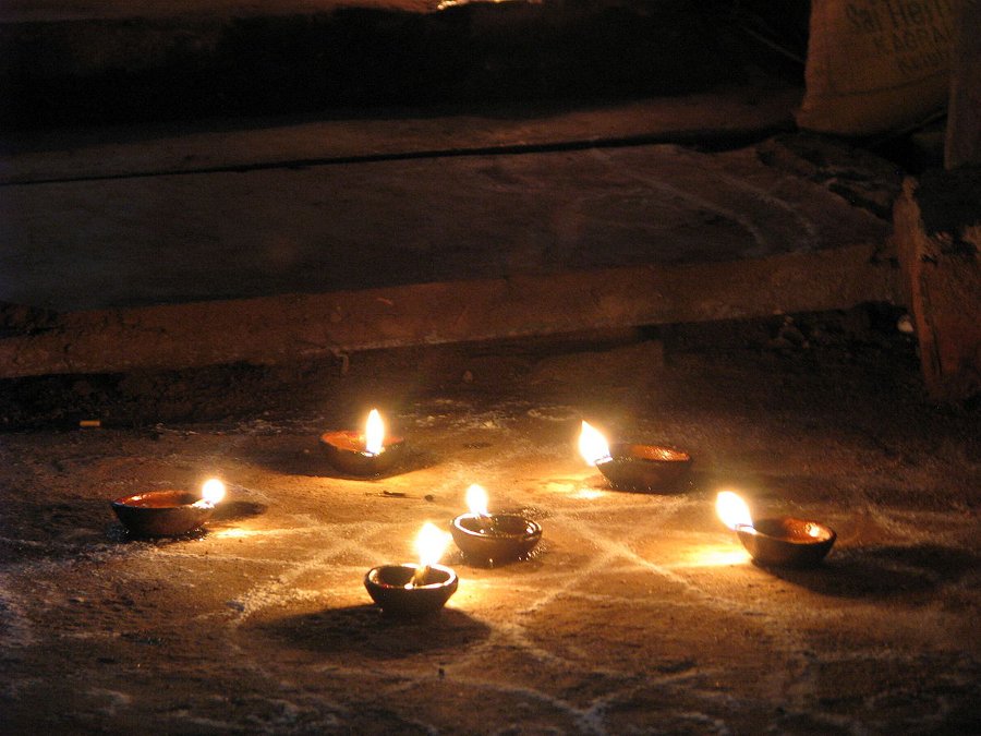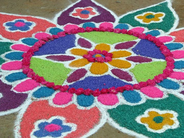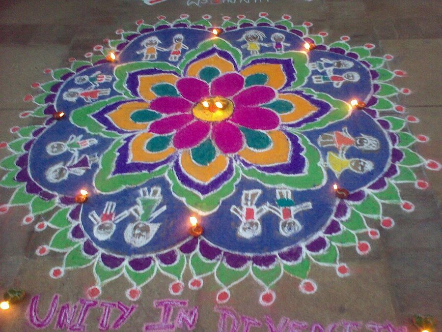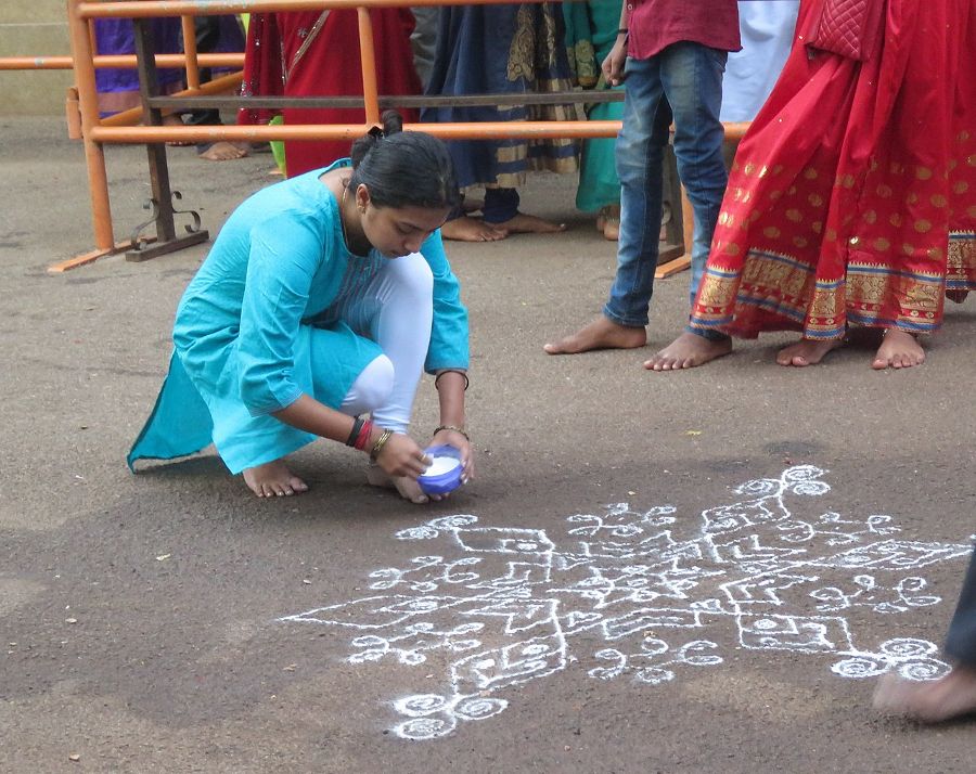 El kolam es un signo de que todos son bienvenidos al hogar, pero especialmente Lakshmi, la diosa de la prosperidad. El dibujo se desarrolla a partir de una matriz inicial de puntos, que son unidos por líneas cerrando el dibujo de forma que los malos espíritus queden fuera.
