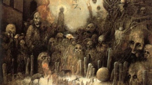Zdzislaw Beksinski (Sanok, 1929-Varsovia, 2005) fue fotógrafo, pintor y escultor, y aunque en sus inicios practicó el arte abstracto, es conocido sobre todo por sus pinturas surrealistas. En desolados parajes desérticos poblados a veces por seres de aspecto cadavérico se alzan extrañas construcciones en ruinas. A pesar de sus tonos sombríos, él decía que algunas de sus obras eran mal entendidas, ya que son más bien optimistas e incluso humorísticas.