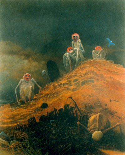 Zdzislaw Beksinski (Sanok, 1929-Varsovia, 2005) fue fotógrafo, pintor y escultor, y aunque en sus inicios practicó el arte abstracto, es conocido sobre todo por sus pinturas surrealistas. En desolados parajes desérticos poblados a veces por seres de aspecto cadavérico se alzan extrañas construcciones en ruinas. A pesar de sus tonos sombríos, él decía que algunas de sus obras eran mal entendidas, ya que son más bien optimistas e incluso humorísticas.