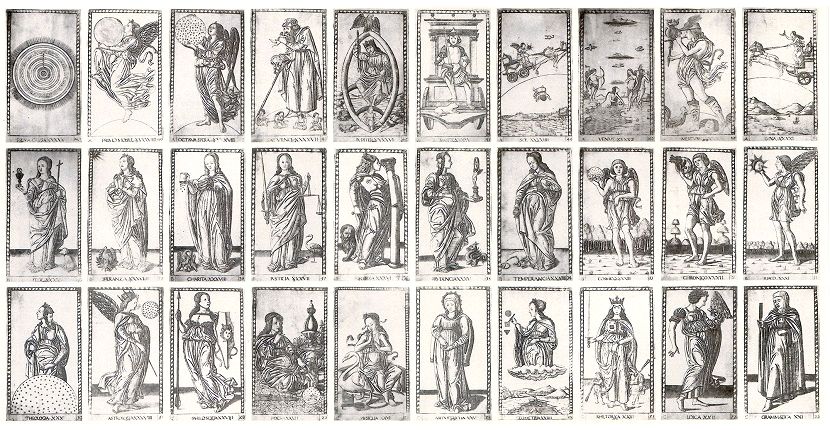 Pueden ver las cartas del Tarot y su interpretación -si acaso les interesa- en La Puerta. Aunque no sean obra de Mantegna ni se trate de un verdadero Tarot son curiosas. Hay otra versión en color, que sospecho es todavía menos auténtica, si cabe.
