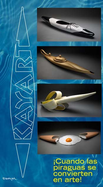 Con Kayart el artista internacional y ganador del premio Mingote Ermengol nos propone un juego, un cambio de las “formas” con una atrevida e innovadora propuesta: la intervención artística y transformación de una veintena de piraguas auténticas y de tamaño real en objetos distintos. Del armazón de una canoa surgen unos seductores labios, un plátano, un insecto o una elegante estilográfica… Poemas visuales que se han expuesto recientemente en la Exposición de Zaragoza 2008 y en la Feria de Arte de Utrecht en Holanda y que ahora recorren toda España con Antonio Busquets como comisario. Una muestra de gran formato que no se limita al espacio reducido de una sala de exposiciones y que necesita expandirse en el espacio urbano.