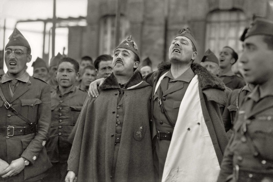 Pero es la cuarta fotografía la que hiela la sangre. El pie dice: “Millán Astray y Franco cantan junto a su tropa. Millán Astray, fundador de la Legión, eligió a Franco para que dirigiera el primer batallón”. Puede que estén cantando, pero la congelación del instante no nos lo permite ver. En todo caso, la cosa es aún peor si en efecto están cantando, porque nadie canta así. Más parece que estén abucheando o desafiando o escarneciendo a alguien. La cara de Millán Astray es la más acabada imagen de la chulería fanática. Alzado con desdén el bigote de hormigas, la dentadura picada e irregular, los ojos semicerrados como para mirar sin ser visto, su gesto es ya un insulto, parece que estuviera diciendo: “¡Anda ya! ¡A tomar por saco!” o alguna frase similar. Le pasa la mano derecha a su compinche por encima del hombro, y la cara de éste es la de un individuo en el que lo último que debería hacerse es confiar. La expresión de irrisión y rechifla, la denigración y la crueldad en la boca, las cejas turbias, los ojillos fríos mirando siempre con avidez, el conjunto del rostro mofletudo y fofo, es el de un criminal. Son un par de facinerosos, sin apelación. Si nos encontráramos hoy día con esas caras, ni la calle cruzaríamos en su compañía. ¿Nadie las vio? ¿Eran percibidas de otra manera en su tiempo?