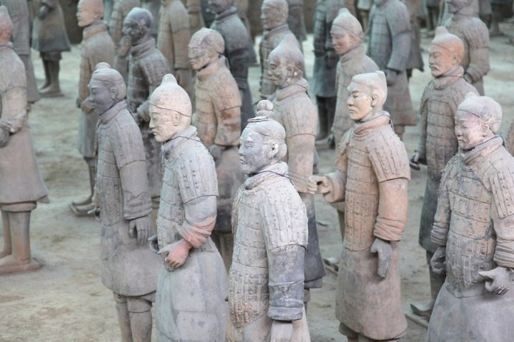 Las últimas figuras de guerreros de terracota desenterradas en el mausoleo del primer emperador chino han podido ser conservadas por vez primera con sus colores originales. Se han encontraron algunas pintadas en rosa, rojo, blanco y lila.