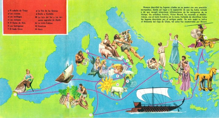 En una vieja enciclopedia he encontrado un mapa ilustrado que representa el viaje narrado por Homero, y ubica los diferentes lugares según Berard, desde Troya hasta Itaca, pasando por los reinos de Circe, Calipso, Nausicaa, la isla de las sirenas, los cíclopes, los lestrigones…