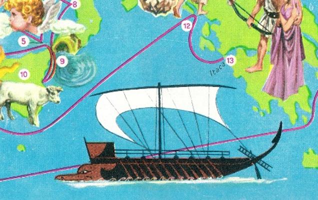 En una vieja enciclopedia he encontrado un mapa ilustrado que representa el viaje narrado por Homero, y ubica los diferentes lugares según Berard, desde Troya hasta Itaca, pasando por los reinos de Circe, Calipso, Nausicaa, la isla de las sirenas, los cíclopes, los lestrigones…