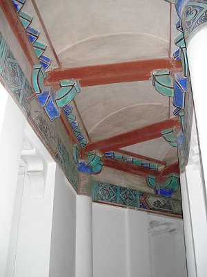 Hay una escalera que conduce a la planta superior y en cada uno de los siete techos hay figuras talladas y pinturas de animales, flores, pájaros y personajes. Se dice que la razón para la construcción de la pagoda fue calmar las crecidas del río Qiantang. Según el historiador Joseph Needham la torre es en realidad un faro que ayuda a la navegación por el río. Desde lo alto de la pagoda se divisa el puente metálico construido en 1930.