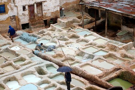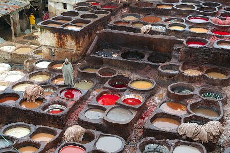 Después las pieles se lavan y se tiñen. Los obreros se ponen en cuclillas y se inclinan sobre las cisternas sumergiendo las pieles en los diferentes tintes. Los colores más utilizados son los naturales: amarillo azafrán, rojo amapola, azul añil y negro antimonio. Para dar la vuelta a las pieles se requiere fuerza y equilibrio. Los tejados y azoteas de las casas están cubiertos de pieles que se cuelgan o se extienden al sol.