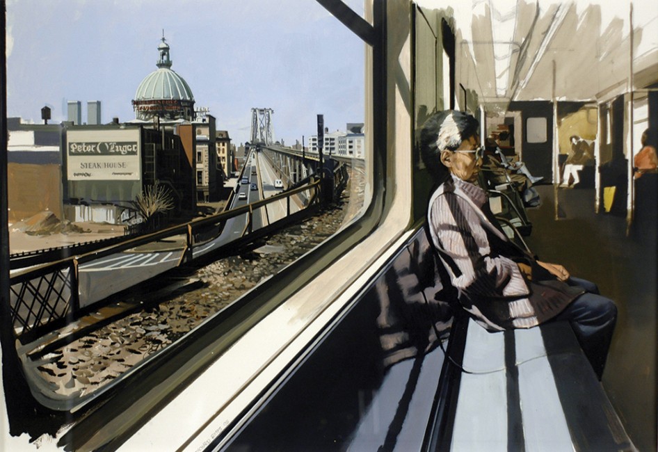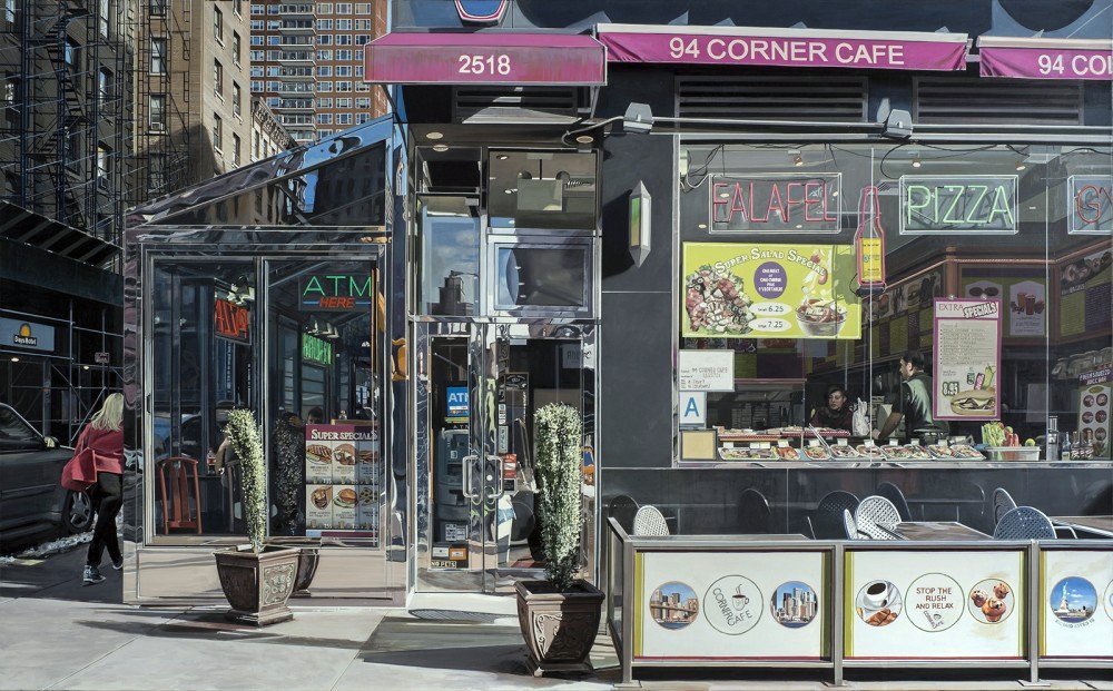 Fachadas, aceras y calzadas, paisajes urbanos frecuentemente vistos a través de la ventanilla de un vehículo o reflejados en el cristal de los escaparates, brillan literalmente en las imágenes de este pintor hiperrealista. Sus perspectivas nos permiten ver simultáneamente interiores y exteriores.