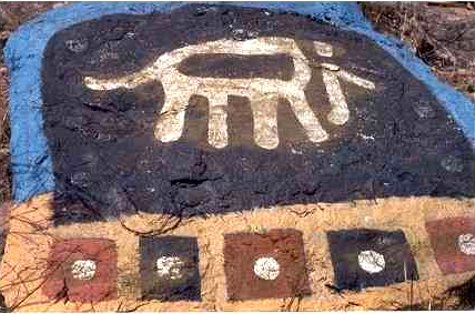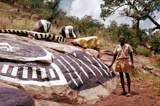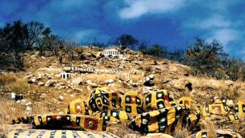 Y es que Mabuza dedicaba su tiempo a pintar las piedras de los alrededores. Había empezado pintando dos sillas, por puro aburrimiento. Luego decoró su choza y después comenzó con las rocas, en colores brillantes, siguiendo patrones geométricos de puntos, rayas y cuadros, así como animales esquemáticos, en un estilo prehistórico, similar al de los aborígenes australianos.