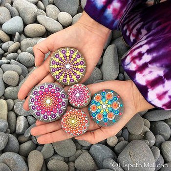 Sus últimos trabajos los realiza sobre pequeñas piedras redondas, que pinta siguiendo los mismos esquemas de punto. Los llama ‘piedras mandala’, porque su diseño recuerda ese símbolo de arte y meditación oriental, el mandala. Cada piedra es única y ha tenido tanto éxito en su venta por internet, que no da abasto para satisfacer la demanda.